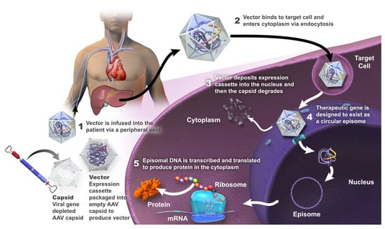 AAV vectors are engineered from a non-pathogenic, non-enveloped linear, single-stranded DNA parvovirus; wild-type AAV is naturally replication-defective and requires a helper virus for replication [4,50,51,52]. These vectors are minimally integrative and associated with a low risk of insertional mutagenesis [48,53,54,55]. The host transcription machinery transcribes the transgene into mRNA, which is then translated into the protein of interest [6]. It is considered that the genome of the recombinant AAV vector does not undergo site-specific integration in the host DNA or alter the genetic process, but is largely episomal in the nucleus of transduced cells [48].