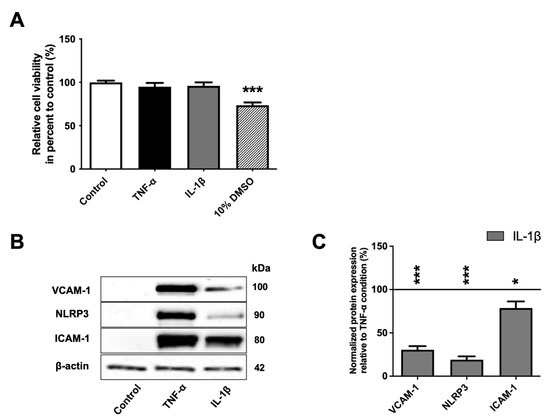 BLECs’ response to TNF-α and IL-1β treatment. (A) After 24 h, the effects of 10 ng·mL−1 of TNF-α or IL-1β on cell viability were performed using MTT assay. A 10% DMSO treatment was used as positive control of cell death. (B) The proinflammatory markers (VCAM-1, NLRP3 and ICAM-1) after TNF-α or IL-1β treatments were observed using Western immunoblotting. The immunoblotting images are representative of at least three independent experiments. (C) The protein levels of the BLEC proinflammatory markers were also quantified compared among proinflammatory treatments. The black line corresponds to the TNF-α condition value set at 100%. For A and C graphs, each bar represents the mean ± SEM and are representative of at least three independent experiments performed in triplicate. The Mann-Whitney t-test was used for the interpretation of statistical data with a threshold of statistical significance compared to the control condition or among proinflammatory cytokines set at * p < 0.05 or *** p < 0.001. VCAM-1: vascular cell adhesion protein-1; NLRP3: « NOD-like receptor family, pyrin domain containing 3; ICAM-1: intercellular adhesion molecule-1.