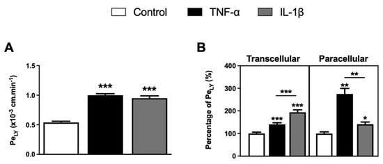 Effects of TNF-α or IL-1β treatments on BLEC monolayer permeability. (A) Following proinflammatory cytokine treatments, BLEC monolayer integrity was determined by measuring the endothelial lucifer yellow permeability (PeLY). (B) The paracellular permeability of LY through BLEC monolayer was also determined by measuring the PeLY at 4 °C, which corresponds to a condition-inhibiting transcellular pathway. The transcellular permeability of LY through BLEC monolayer was deducted by subtracting the total permeability of LY from its paracellular permeability. The percentage of PeLY values was established in relation to their control condition. The control values for total, paracellular and transcellular PeLY are equal to 0.54 ± 0.02 × 10−3, 0.18 ± 0.01 × 10−3 and 0.36 ± 0.02 × 10−3 cm·min−1, respectively. Each bar represents the mean ± SEM and is representative of at least three independent experiments performed in triplicate. The threshold for statistical significance compared to the control condition or among proinflammatory cytokines was set to * p < 0.05; ** p < 0.01; *** p < 0.001.