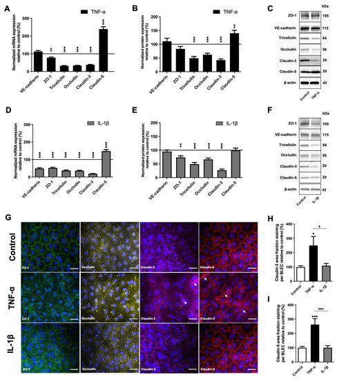 BBB has restrictive properties primarily due to the closed junctional complex. Paracellular changes in BBB permeability induced by TNF-α and IL-1β could correlate with changes in the expression of tight junction (TJ) and adherent junction (AJ) proteins at the transcript and protein level. For this purpose, real-time qPCR and Western immunoblotting experiments were employed to evaluate the effects of TNF-α and IL-1β exposure on the expression of ZO-1, tricellulin, occludin, claudin-3 and claudin-5 as representatives of TJ proteins, as well as VE-cadherin as a representative of AJ proteins.