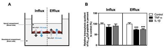 As TNF-α and IL-1β modulated the protein expression levels of LRP1, BCRP and PICALM (Figure 4), we investigated the effect of these cytokines on the transport of Aβ peptide across the BBB. After 24 h of treatment with proinflammatory cytokines, the apical-to-basolateral (influx) and basolateral-to-apical (efflux) Aβ1–40Cy5 peptide transports across the BLECs were assessed in the presence of FITC-inulin. The Aβ1–40 peptide was used in all experiments, as it is the most abundant amyloid peptide found on cerebral blood vessels [28]. FITC-inulin was used to determine the nonspecific transcytosis quotient (Figure 5A). Indeed, unlike Aβ peptide, FITC-inulin is not actively cleared at the BBB and acts as a reference marker of paracellular permeability, thus as previously reported [9].