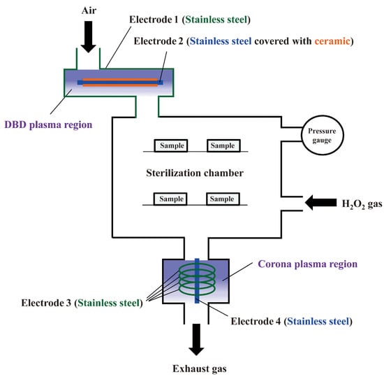 - Sakudo, A.; Tsuji, Y. Hydrogen peroxide gas plasma sterilizer combined with dielectric barrier discharge and corona discharge inactivates prions. Appl. Sci. 2021, 11, 9777. [Google Scholar] [CrossRef]