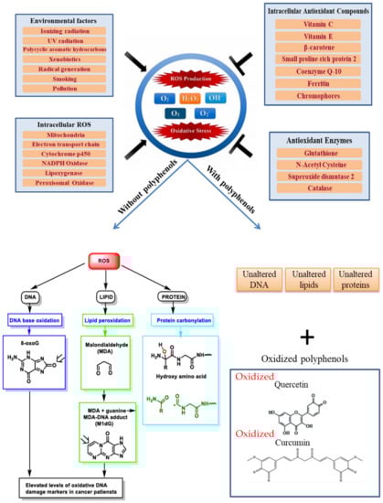 Skin possesses its own antioxidant protective mechanisms, which blocks some of the damaging effects of different carcinogens and environmental pollutants such as UV radiation, leading to the generation of oxygenated molecules called “free radicals”. However, when there is extensive exposure to these factors, the antioxidant capacity may be exceeded and become less efficient, causing premature aging, immunosuppression, and skin cancers. Prolonged carcinogen exposure can cause epidermal lipid peroxidation and unnecessary infiltration of the leukocytes into the skin. These can further cause the excessive production of hydrogen peroxide (H2O2), nitric oxide (NO), and other ROS, which leads to oxidative stress. Natural polyphenols protect cell constituents from oxidative damage by scavenging these free radicals [25].