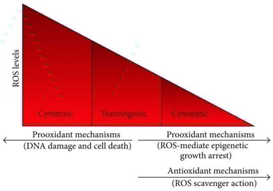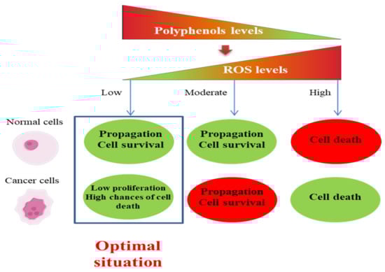 ROS need to be kept at an optimum level to maintain cellular proliferation and survival. Increased ROS production and accumulation promote apoptosis. On the other hand, when ROS levels drop below a specific threshold, ROS-mediated signaling cascades can be disrupted and cell growth inhibited. Moreover, there are also high chances of cell death. By increasing cellular antioxidants, for instance, through polyphenol therapy and targeting sources of ROS, oxidative stress can be kept under control, leading to growth inhibition and high susceptibility to cell death in cancer cells, without affecting the normal cells very much. In this case, we can consider an optimal situation (tumoral cells are destroyed while normal cells are only marginally affected) (Figure 3) [13].