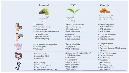 The numerous anticarcinogenic properties of polyphenols include their ability to suppress the formation of tumors, angiogenesis, metastasis, and inflammation as well as to trigger apoptosis. Additionally, they can control immune system responses and protect healthy cells from harmful free radicals. The majority of studies on the anticancer effects of polyphenols have been based on individual substances. For instance, resveratrol has been linked to a number of anti-cancer biological processes including the suppression of glucose uptake, metastasis, and the induction of apoptosis. It has been found that EGCG can control cancer cell growth, metastasis, angiogenesis, and other aspects of cancer evolution by altering several processes. Curcumin has also been shown to suppress cellular growth and angiogenesis, stop cell cycle progression in tumor cells, and trigger apoptosis in various cancer models (Figure 4) [24].