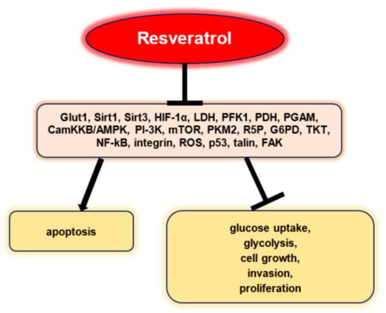 Resveratrol’s anti-neoplastic effects via the regulation of tumor glucose metabolism [39].