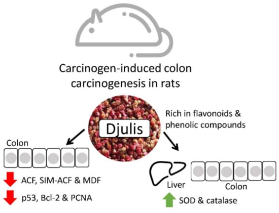 - Lee, C.-W.; Chen, H.-J.; Xie, G.-R.; Shih, C.-K. Djulis (Chenopodium Formosanum) Prevents Colon Carcinogenesis via Regulating Antioxidative and Apoptotic Pathways in Rats. Nutrients 2019, 11, 2168. [Google Scholar] [CrossRef] [PubMed]
