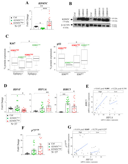 Expression analysis in KDM5CLow and KDM5CHigh cohorts. (A) Analysis of KDM5C expression by real-time PCR (RT-PCR) assay and (B) Western blotting. (C) Ki67 expression analysis in GBM patients with (Epilepsy+) or without epilepsy (Epilepsy−), and p53 expression analysis in GBM patients with wild-type (WT) or mutated IDH1/2 (mut) alleles. (D) RT-PCR analysis of BDNF, HIF1A, and BIRC5. (E) Scatter plots reporting the correlation—by linear regression analysis—of HIF1A and BIRC5 expression in the KDM5CLow and KDM5CHigh subgroups. (F) RT-PCR analysis of p75NTR expression in healthy controls, KDM5CLow, and KDM5CHigh GBM samples. (G) Scatter plot reporting the correlation—by linear regression analysis—of HIF1A and p75NTR expression in the KDM5CLow and KDM5CHigh subgroups. Each transcript analysis was performed in triplicate, and the samples were normalized with the TATA-Box Binding Protein (TBP) transcript. The bars indicate the mean ± SEM of repeated experiments. Asterisks indicate statistical significance compared with healthy control samples: *** p < 0.0005, ** p < 0.005, and * p < 0.05. The Western blotting experiment was repeated in triplicate, and the beta-actin antibody (β-ACTIN) was used as a loading control. In the scatter plots, the average expression value of healthy control samples was used as a reference. The Pearson’s correlation coefficient (r) and p-values (p) are indicated on the top of each plot. In the box plot, the black thick line inside the box represents the median of the values, and the 25th and 75th percentiles are shown as boundaries of the box. The Student’s t-test was applied with * p < 0.05.