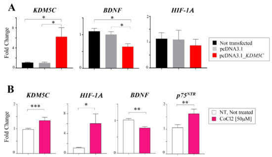 Expression analysis in T98G cell lines. (A) RT-PCR analysis of KDM5C, BDNF, and HIF1A transcripts in T98G cell lines transiently transfected with a plasmid expressing KDM5C or a plasmid containing the empty vector. (B) RT-PCR analysis of KDM5C, HIF1A, BDNF, and p75NTR in T98G cell lines exposed to cobalt chloride (CoCl2). Each transcript analysis was performed in triplicate, and the samples were normalized with the 18S transcript. The bars indicate the mean ± dev.st. of repeated experiments. Asterisks indicate statistical significance compared with the control samples: *** p < 0.0005, ** p < 0.005, and * p < 0.05.