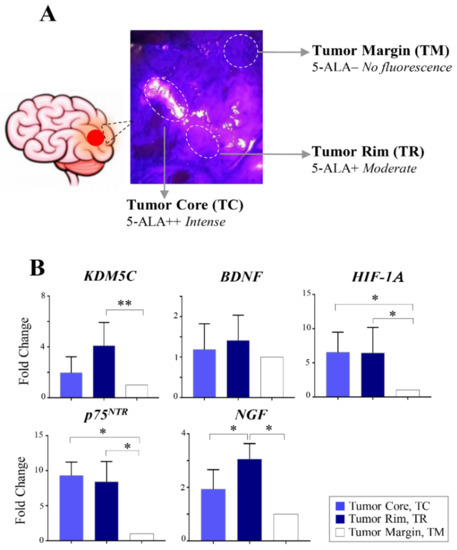 Expression analysis in GBM areas isolated by 5-aminolevulinic acid fluorescence-guided surgery. (A) Intraoperative photographs obtained in the GBM patient #45. 5-ALA administration showing the resection cavity illuminated with blue light, demonstrating intense and moderate 5-ALA fluorescence representing the tumor core and tumor rim, respectively. (B) RT-PCR analysis of the KDM5C, BDNF, HIF1A, p75NTR, and NGF transcripts in different layers identified by 5-ALA surgery. Each transcript analysis was performed in triplicate, and the samples were normalized with the TATA-Box Binding Protein (TBP) gene. The bars indicate the mean ± SEM of repeated experiments. Asterisks indicate statistical significance compared with the healthy control samples: ** p < 0.005 and * p< 0.05.
