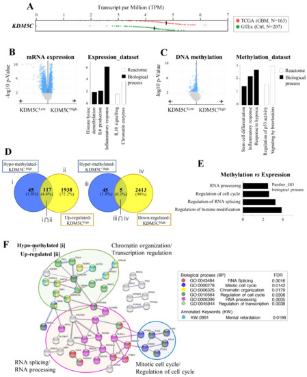 Features of the KDM5CLow and KDM5CHigh subgroups in the TCGA dataset. (A) KDM5C expression (transcript per million, RNA-Seq data) in the GBM samples (TCGA; N = 163) compared to control post-mortem brains (GTeX portal; N = 207). (B,C) On the left, volcano plots reporting differential mRNA expression and methylation between the two GBM subgroups (downloaded from cBioportal). On the right, bar graphs reporting the results of Gene Ontology and pathway analysis on differentially expressed (B) and methylated (C) genes between the two tumor subgroups. (D) Venn diagrams of hypomethylated/overexpressed genes and hypermethylated/downregulated genes in the KDM5CHigh cohort. (E) Gene Ontology analysis of DEGs regulated by methylation changes (DEGs_meth) in KDM5CHigh (KDM5CHigh/DEGs_meth) by using the Panther classification system (www.pantherdb.org; accessed on 1 June 2022). (F) Network analysis of protein–protein interactions for KDM5CHigh/DEGs_meth genes using the STRING database.