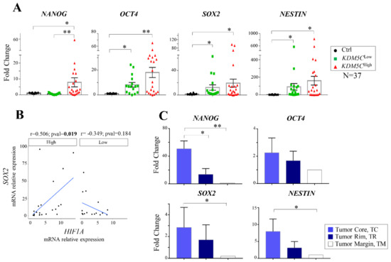 Expression analysis of the stem cell-associated genes in GBM tumor samples. (A) RT-PCR analysis of NANOG, OCT4, SOX2, and NESTIN in the KDM5CLow and KDM5CHigh cohorts. (B) Scatter plot reporting the correlation—by linear regression analysis—of HIF1A and SOX2 in the KDM5CLow and KDM5CHigh subgroups. The average expression value of healthy control samples was used as a reference. The Pearson’s correlation coefficient (r) and p-values (p) are indicated on the top of each plot. (C) RT-PCR analysis of NANOG, OCT4, SOX2, and NESTIN in 5-ALA FGS tissues. Each transcript analysis was performed in triplicate, and the samples were normalized with the TATA-Box Binding Protein (TBP) gene. The bars indicate the mean ± SEM of repeated experiments. Asterisks indicate statistical significance compared with healthy control samples: ** p < 0.005 and * p< 0.05.