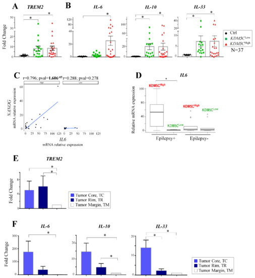 Next, given the enrichment of genes differentially methylated belonging to the Reactome pathway “inflammation”, we measured the gene expression of Triggering Receptor Expressed on Myeloid cells-2 (TREM2), a microglia surface receptor involved in neuroinflammation that is overexpressed in the glioma and associated with tumor progression [54,55]. A pronounced increase of TREM2 was detected in both GBM subgroups compared to the control tissues (Figure 6A). Furthermore, we measured the expression of the genes encoding proinflammatory cytokines Interleukin-6 (IL6), Interleukin-10 (IL10), and Interleukin-33 (IL33), associated with increased cell proliferation and tumorigenesis in GBM [56,57,58]. In line with the literature data [56,57,58], IL10 and IL33 were overexpressed in the entire cohort of GBM patients compared to the healthy samples (Figure 6B). However, IL6 was robustly induced only in the KDM5CHigh samples (Figure 6B), and interestingly, it showed a significant positive correlation with NANOG only in this tumor subtype (Figure 6C). Interestingly, exploring the clinical features of GBM patients, we found a significant change in IL6 expression between the two KDM5C subgroups with epilepsy (Figure 6D). Moreover, measuring the TREM2 expression and the inflammatory cytokine genes in the 5-ALA FGS tissues, we found that their levels are higher in TC areas compared to the TR and TM ones (Figure 6E,F), further corroborating the previous findings about the role of the inflammatory response in GBM. However, our data highlight how these molecular features of such a tumorigenesis-related process vary according to the surrounding TMEs in the context of GBM.