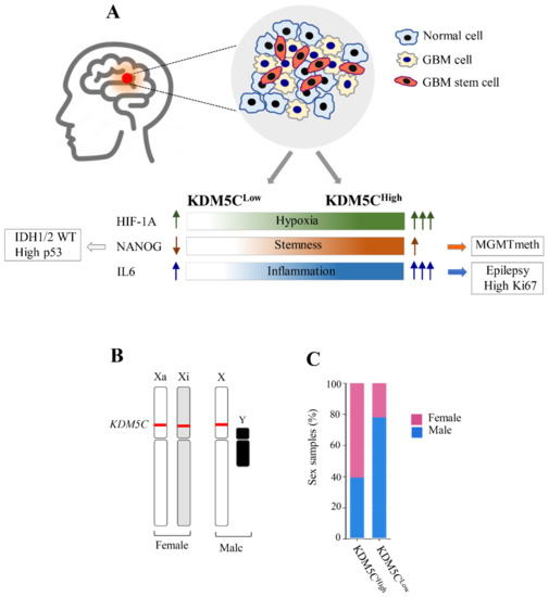 Molecular features of GBM patients stratified by expression data of the chromatin oxygen sensor gene KDM5C. (A) High expression levels of the tumor markers HIF1A, NANOG, and IL6 are associated with a high level of KDM5C. (B) KDM5C expression variability in female and male individuals. Since KDM5C escapes X-inactivation, two active alleles (in red) are present in female individuals, unlike the male individuals, in which only one allele drives the expression of KDM5C. (C) Sex-related distribution in the KDM5CHigh and KDM5CLow GBM subgroups identified in TCGA. Xa, X chromosome active; Xi, X chromosome inactive.