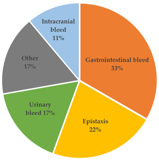 In Table 3, we recorded and characterized the first bleeding event within 1 year of LVAD implantation. After surgery the most common source of bleeding was gastrointestinal (33%), followed by epistaxis (22%), urinary tract-related causes and hematoma (17%, respectively) as well as intracranial bleeding events (Figure 1). Major bleeding events were identified in 61% of patients, and 39% had a minor bleeding event. The incidence of NSB occurred on average 70 ± 79 days after LVAD implantation (Table 3).