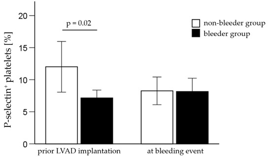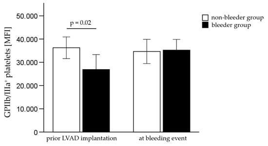 Furthermore, the surface expression level of GPIIb/IIIa on platelets, measured by the MFI, was significantly decreased (p = 0.02) in bleeders compared to non-bleeders prior LVAD implantation (Figure 3, Table 6).