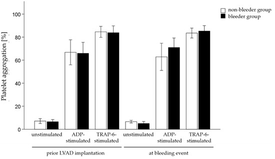 The platelet function was measured by aggregometry testing before and after LVAD implantation. Results showed that neither the percentage of unstimulated platelets, nor ADP-stimulated platelets and TRAP6-activated platelets changed in patients with NSB and those patients who remained free of bleeding complications (Figure 4).