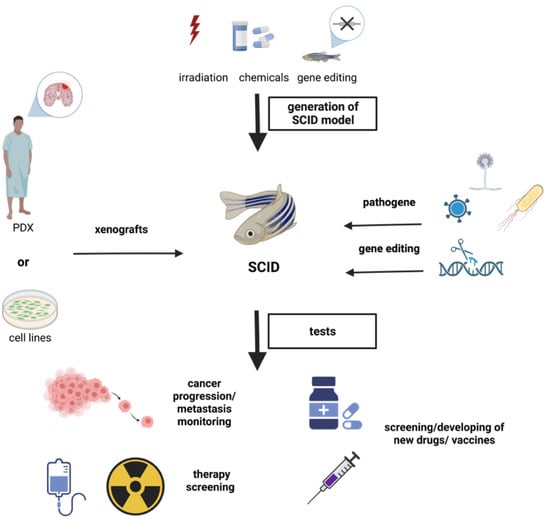 The results of histology, RNA sequencing, and single-cell transcriptional profiling showed a decrease in mature T and B cells in prkdc-deficient ZF []. This model has been successfully used to engraft human leukemia cells and drug tests []. Another model based on prkdc−/−, il2rga−/− zebrafish has been used as PDX for melanoma, breast cancer embryonal rhabdomyosarcoma (ERMS), and glioblastoma. Preclinical RMS analysis showed sensitivity to a combination of olaparib and temozolomide. Interestingly, these results have been confirmed in the SCID mice model [].