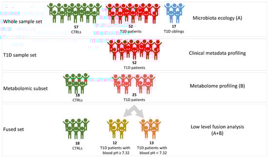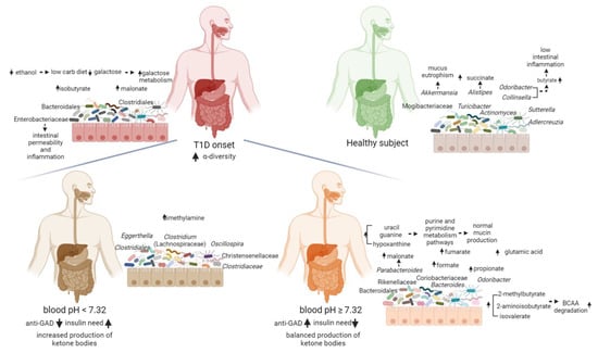 Del Chierico, F.; Conta, G.; Matteoli, M.C.; Fierabracci, A.; Reddel, S.; Macari, G.; Gardini, S.; Guarrasi, V.; Levi Mortera, S.; Marzano, V.; et al. Gut Microbiota Functional Traits, Blood pH, and Anti-GAD Antibodies Concur in the Clinical Characterization of T1D at Onset. Int. J. Mol. Sci. 2022, 23, 10256. https://doi.org/10.3390/ijms231810256