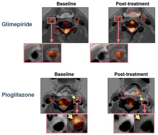 - Mizoguchi, M.; Tahara, N.; Tahara, A.; Nitta, Y.; Kodama, N.; Oba, T.; Mawatari, K.; Yasukawa, H.; Kaida, H.; Ishibashi, M.; et al. Pioglitazone Attenuates Atherosclerotic Plaque Inflammation in Patients with Impaired Glucose Tolerance or Diabetes: A Prospective, Randomized, Comparator-Controlled Study Using Serial FDG PET/CT Imaging Study of Carotid Artery and Ascending Aorta. JACC Cardiovasc. Imaging 2011, 4, 1110–1118. [Google Scholar] [CrossRef]