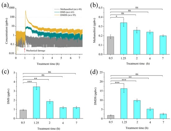 Determination of sulfur volatiles from guava plants with or without mechanical damage with a proton-transfer-reaction mass spectrometer (PTR-MS). (a) Real-time determination of sulfur volatiles from guava plants. (b–d) The concentration of methanethiol, dimethyl sulfide (DMS), and dimethyl disulfide (DMDS) at each time point. Data are shown as means ± SE (n = 6). Asterisks indicate significant differences between mechanical damaged and control (undamaged) plants based on Student’s t-test (* p < 0.05, ** p < 0.01, and *** p < 0.001); ns, no significant difference.