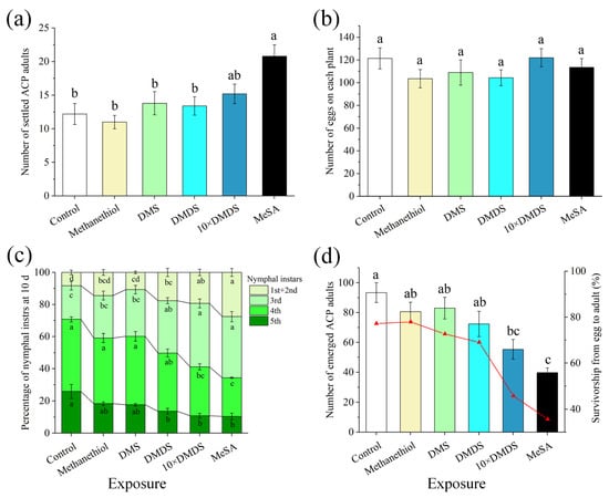 Exposure of sweet orange plants to sulfur volatiles affected the host selection behavior and population development of Asian citrus psyllid (ACP). (a) The number of settled ACP adults at 24 h after their release in wind tunnels. (b) The number of eggs on each plant after ACP oviposition for 48 h. (c) The percentage of nymphal instars at 10 d after ACP release for oviposition. (d) The number of total emerged adults (columns) and the rate of survivorship (dotted line) from egg to adult. Data are shown as means ± SE (n = 5). Different letters on the columns indicate significant differences among the different treatments based on Tukey’s test (p < 0.05).