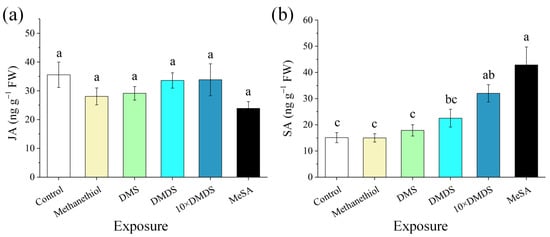 The levels of jasmonic acid (JA) and salicylic acid (SA) in orange plants after exposure to sulfur volatiles. (a) JA content; (b) SA content. Data are shown as means ± SE (n = 5). Different letters on the columns indicate significant differences among different treatments based on Tukey’s test (p < 0.05).