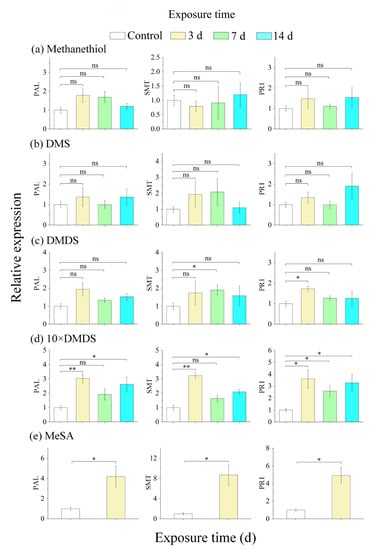 The expression of phenylalanine ammonia lyase (PAL), salicylate-O-methyl transferase (SMT), and pathogenesis-related (PR1) genes of orange plants after exposure to sulfur volatiles. Data are shown as means ± SE (n = 3). Asterisks indicate significant differences between exposed and control plants, based on Student’s t-test (* p < 0.05 and ** p < 0.01); ns, no significant difference.