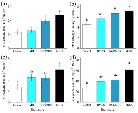 Phenylalanine ammonia lyase (PAL), polyphenol oxidase (PPO), and peroxidase (POD) activities and total phenol content of orange plants after exposure to dimethyl disulfide (DMDS). (a–c) PAL, PPO, and POD activities, respectively; (d) total phenol content. Data are shown as means ± SE (n = 3). Different letters on the columns indicate significant differences among different treatments based on Tukey’s test (p < 0.05).
