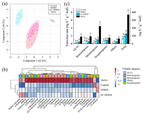 Volatile profiling of orange plants after exposure to dimethyl disulfide (DMDS). (a) PLS-DA (score plot); and (b) clustering analysis and heat map (average) of orange volatile metabolites. (c) Emission of orange volatiles from different classifications. Data are shown as means ± SE (n = 6). Different letters on the columns indicate significant differences among different treatments based on Tukey’s test (p < 0.05).