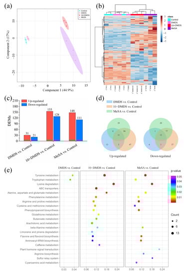 Characterization of the differentially expressed semipolar metabolites (DEMs) of orange plants after exposure to dimethyl disulfide (DMDS). (a) PLS-DA (score plot); and (b) clustering analysis and heat map of expression measures of semipolar metabolites. (c) The number of DEMs in different groups (for details, see Supplementary Table S2). (d) Venn diagram showing the distribution and overlap of up- and downregulated DEMs across all treatments. (e) KEGG pathway enrichment of DEMs.