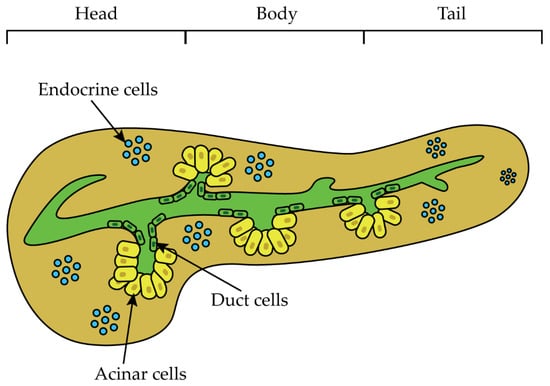 Pancreas anatomy. Macroscopically the pancreas is subdivided into three different parts named the head, body, and tail. Microscopically, it is composed of three main cell types: the endocrine cells designated for the release of hormones, acinar cells, which produce digestive enzymes, and duct cells secreting bicarbonate [4].