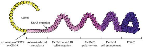 Evidence suggests that PDAC develops from acinar and/or ductal cells and progresses in a state of chronic inflammation where alternatively activated macrophages recruit regulatory T lymphocytes, creating a highly immunosuppressive microenvironment [22]. Subsequently, cancer-associated fibroblasts produce and release collagen and hyaluronan, increasing interstitial gel fluid pressure and creating an extracellular matrix that impairs blood vessel formation and maintenance, leading to hypoxia [22,23,24]. The following are the three best characterized precursors of PDAC: pancreatic intraepithelial neoplasia (PanIN), intraductal papillary mucinous neoplasms (IPMN). and mucinous cystic neoplasms (MCN) [10,25,26]. Acinar-to-ductal metaplasia (ADM) is considered the parent lesion of PanIN [27]. The generation of ductal-like cells starting from pancreatic acinar cells is the consequence of the ADM process [27]. As a consequence of ADM, the acinar cells showed an enhancement in the expression of typical ductal biomarkers such as sex-determination region Y box 9 (SOX9) or cytokeratin-19 (CK-19), while there is a reduction in the expression in acinar biomarkers such as Mist-1 or amylase [27]. The condition of ADM can be reversible; however, in the presence of particular conditions, such as KRAS mutations, the condition becomes irreversible and progresses to PanIN [27]. PanIN are noninvasive microscopic mucinous papillary lesions less than 5 mm in size that form in smaller pancreatic ducts and are thought to be associated with chronic pancreatitis [10,11]. Continuous cycles of epithelial damage and repair lead to the development of PDAC [10,11]. PanIN lesions are the most common precursors of PDAC and are classified into different stages: PanIN-1A and PanIN-1B, PanIN-2, and PanIN-3, which are characterized by a progressive degree of cellular and nuclear atypia (Figure 2) [4,10,11,26].