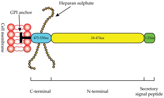 GPC1 was the first member of the HS proteoglycans to be discovered [74]. The GPC1 gene is located on chromosome 2 (2q37.3) and consists of 32,381 base pairs of genomic DNA with nine exons [75]. The GPC1 protein consists of 558 amino acids with a molecular weight of 62 kDa [75]. The first 23 amino acids represent the secretory signal peptide, the N-terminal region ranges from 24 to 474 amino acids, and the C-terminal region ranges from 475 to 530 (Figure 3) [76]. The C-terminal domain terminates with a hydrophobic region essential for GPI anchor linkage (Figure 3) [76].
