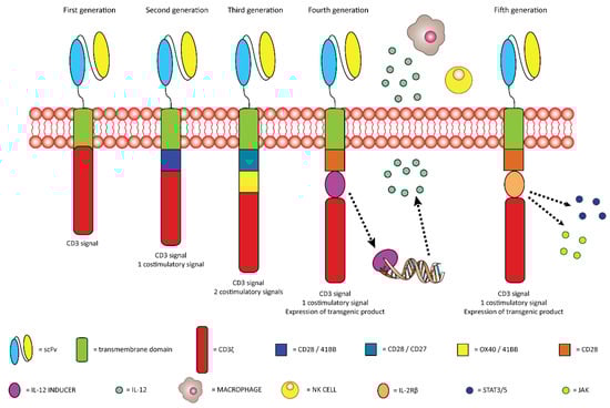 The development of chimeric antigen receptor T (CAR-T) cells starts with the isolation of blood T cells from patients. These cells are subsequently tuned in order to express a receptor with the capability to recognize a specific TAA [93]. The general structure of CAR-T cells is composed of the molecule designated for the recognition of the TAA that, in most cases, is a single chain variable fragment (scFv), the spacer domain or hinge that provides both flexibility, enhancing the efficacy of the scFv, and a connection between the scFv and the transmembrane domain. The transmembrane domain is necessary for the communication between the scFv and the intracellular domain that is the one necessary for the organization of the response against the target cells [94]. To date, five generations of CAR-T cells, based on the organization of the intracellular domain, have been developed (Figure 4) [95].