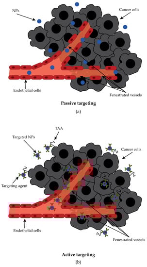 Panel (a): Passive targeting. NPs extravasate from blood circulation through the fenestrated vessels present in the leaky vasculature of a tumor, taking advantage of the EPR effect. Panel (b): Active targeting. NPs reach the tumor site through EPR and interact with the TAA through the targeting agent bound on the NPs surface.