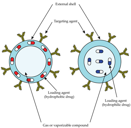 Schematic representation of NBs for drug delivery. Hydrophilic drugs are incapsulated in the external shell, and hydrophobic drugs are incapsulated in the gas core.