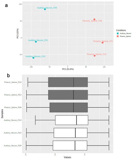 Data quality control of phoenix sphere and auditory neuron samples. (a) PCA plot displays that the phoenix sphere and auditory neuron samples were clearly divided into two clusters; (b) the quantile normalisation boxplot of samples. Vertical black lines in the boxes represent medians.