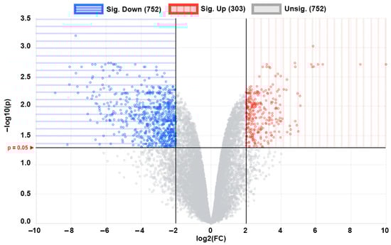 The as-obtained TXT format count matrix was uploaded onto the NetworkAnalyst 3.0 (https://www.networkanalyst.ca/ (accessed on 28 June 2022)) [75], a comprehensive gene-centric platform supporting gene expression profiling, biological network analysis and visual exploration. A total of 18,416 (97%) out of 18,880 gene IDs were successfully matched with the webtool internal Entrez ID database. Unannotated genes were filtered out and the log2-counts per million method was applied to the remaining genes for normalisation. After that, the limma package [76] was utilised for identification of DEGs with the thresholds of adjusted p-value < 0.05 and |log2FC| > 2.0. A table containing identified DEGs was then generated and downloaded for further analysis.