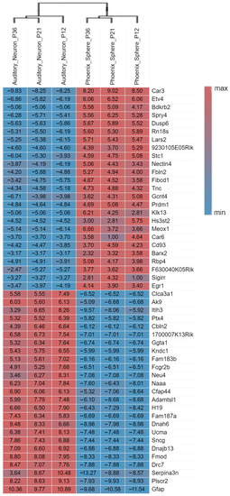 The dataset E-MTAB-9441 (https://www.ebi.ac.uk/arrayexpress/experiments/E-MTAB-9441/ (accessed on 26 June 2022)) was downloaded from the repository ArrayExpress (https://www.ebi.ac.uk/arrayexpress/ (accessed on 26 June 2022)) [68], which contains six paired RNA sequencing (RNA-Seq)-based transcriptomes of differentiated (day 7) phoenix auditory mature neurons and undifferentiated (day 0) phoenix sphere neuroprogenitors at passage 12, 21, and 36, respectively. Samples were paired at passage 12, 21, and 36 forming a triplicate. According to the original paper, although collected at different numbers of passages (from P12 to P36), triplicate samples from undifferentiated and from differentiated cells were well clustered, suggesting a conserved pattern of gene expression with passages. Details regarding cell extraction and preparation for RNA-Seq were elaborated in the source literature by Rousset et al. [30]. The downloaded RAW FASTQ files were then preprocessed on the Galaxy (https://usegalaxy.org/ (accessed on 26 June 2022)) [69,70], a platform integrated with hundreds of packages and tools for analysing RNA-Seq data, to perform quality check and remove poorly or non-expressed genes before proceeding to downstream analyses. The FASTQ files were firstly quality-checked by the FastQC (v. 0.11.9) [71], followed by removing low-expressed genes via the Trimmomatic (v. 0.38.0) [72] using the following thresholds: PE; ILLUMINACLIP: TruSeq2:2:30:10:8; SLIDINGWINDOW: 5:20; LEADING: 3; TRAILING: 3; MINLEN: 50. The filtered data were then loaded onto the HISAT2 [73] to map sequences with the UCSC Mus musculus mm10 reference with an average mapping rate of 88.36%, and generated BAM format files. The sequence reads were counted by featureCounts (v. 2.0.1) [74] which generated a matrix table of counts for the following bioinformatic analyses. The initial number of genes in the set was 24,420, of which 18,880 genes were left after the aforementioned preprocessing.