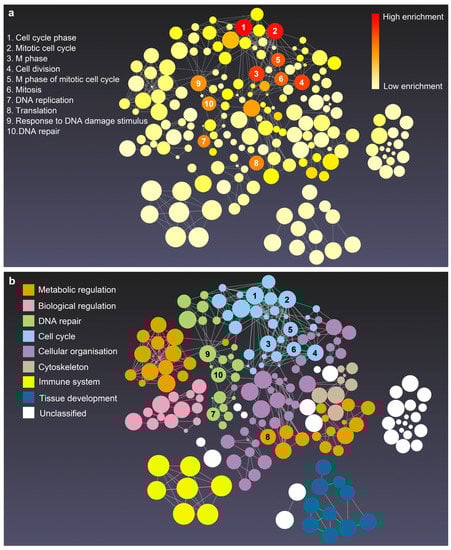 The enrichment network of biological process of phoenix spheres. Created in the enrichment visualisation tool on the NetworkAnalyst platform. Bubble size is associated to the size of gene sets. (a) Enrichment network with red to light yellow colours based on the adjusted p-value. Red represents the lowest p-value while light yellow stands for the highest p-value; (b) the identical network as (a) but coloured according to the categories of GO terms. Each colour belongs to one category of terms. The spatial distance between different categories indicates similarity. The closer the more similar in biological process. The numbers 1 to 10 on (a,b) represent the top 10 enriched terms.