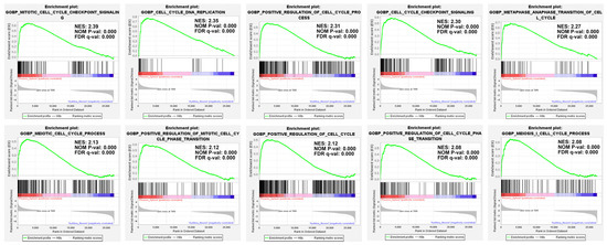 GSEA enrichment plot. In the phoenix sphere group, the top 10 significantly up-regulated gene sets from the cell cycle collection were demonstrated. The mitotic cell cycle checkpoint signalling, cell cycle DNA replication, and positive regulation of the cell cycle process are the leading gene sets.