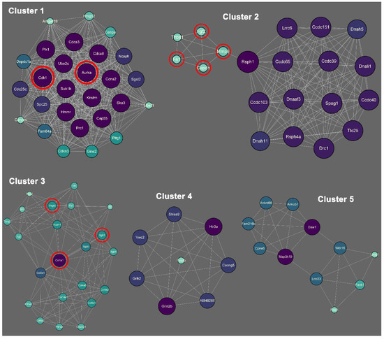 Biofunctional sub-clusters extracted from the main PPI network. Purple and larger size represent higher degree, while green and smaller size indicate lower degree. Red circles highlight the hub genes.