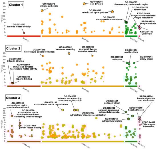 Bubble plot of enriched BP, CC, MF GO terms and KEGG pathways in sub-cluster 1, 2, and 3. Bubble size represents term size. In the vertical direction, the higher the bubble, the more significantly enriched. In the horizontal direction, colour stands for the categories of terms, and distance between bubbles indicates the similarity. Terms from the same subtree stay close to each other.