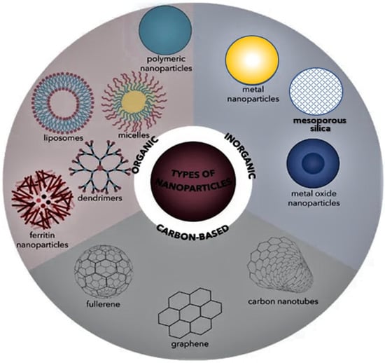 Different types of nanomaterials have been used to improve the properties of polymeric matrices. According to their nature, these nanofillers can be classified into three main groups, as depicted in Figure 2: (1) organic, including dendrimers, micelles, liposomes, polymer nanoparticles (NPs), and ferritin; (2) inorganic, including metal NPs (Ag, Au, Cu), metal oxide NPs (e.g., Fe3O4, ZnO, MgO, TiO2), hydroxyapatite (HA), and mesoporous silica; (3) carbon-based, including fullerenes, quantum dots, carbon nanotubes, graphene, and nanodiamond [,]. In the following section, those typically used as nanofillers in PMMA matrices will be briefly described.