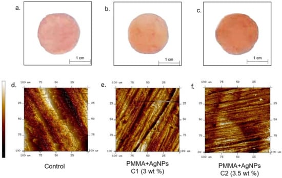 Images of PMMA without NPs (control) (a); PMMA + AgNPs (3 wt%) (b) and PMMA + AgNPs (3.5 wt%) (c): The color became darker with increasing concentrations of the NPs. AFM topographical images of PMMA without NPs added (control) (d); PMMA + AgNPs (3 wt%) (e) and PMMA + AgNPs (3.5 wt%) (f). Reprinted from ref. [], copyright 2019, MDPI.