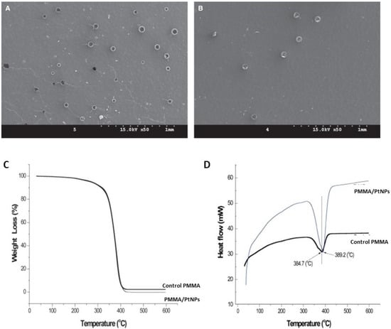 PtNPs were also incorporated into PMMA to develop antimicrobial nanocomposites [], which were tested against S. mutans and S. sobrinus. The PMMA/PtNP nanocomposites showed a bacterial anti-adherent impact rather than a bactericidal effect above a concentration of 50 mg/L when compared to bare PMMA with very small amounts of Pt+ eluted, along with superior mechanical properties. According to SEM analysis, they exhibited similar surface texture with slightly greater surface cracking and blistering than pure PMMA (Figure 4a,b). Furthermore, according to TGA and DSC analyses, the nanocomposites had comparable thermal stability and a somewhat higher melting point than the neat matrix (Figure 4c,d, respectively), demonstrating improved thermal properties. For dental applications, the long-term effect of this activity, biocompatibility, and color stability should be investigated. In another study, it was found that each metallic NP can have a different effect on the PMMA matrix: while Ag and Pt can improve bending deflection and Pd can enhance bending strength and Vickers hardness [].