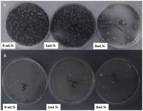 C.F.U. of P. aeruginosa (A) and E. faecalis (B) on nutrient agar after growing it for 48 h on PMMA composites containing 0, 1, and 3 wt% TiO2. Reprinted from ref. [], copyright 2018, MDPI.