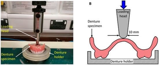 (A) Application of bending load on the palatal surface of PMMA/ZrO2 denture specimen using a Hounsfield universal testing machine and (B) schematic diagram of loading conditions. Reprinted from ref. [], copyright 2020, MDPI.