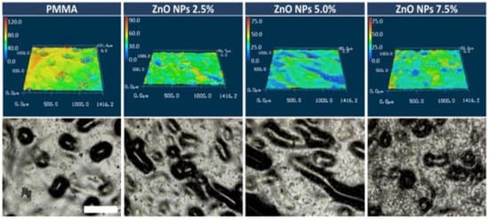 Surface topography of PMMA/ZnO nanocomposites: 3D laser microscope images (top) and optical laser-enhanced images (bottom). The scale bar (white) refers to 400 µm and it is applicable to all images. Reprinted from ref. [], copyright 2018, MDPI.